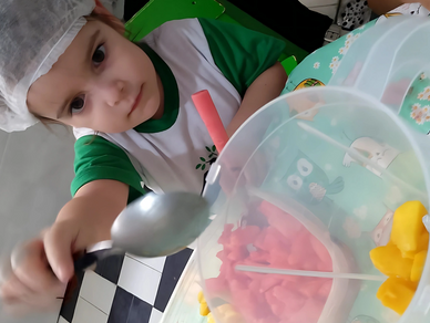 Na cozinha experimental, as crianças exploram os alimentos de maneira prática e divertida, aprendendo sobre ingredientes, sabores e texturas. Elas participam do preparo de pratos saudáveis, desenvolvendo autonomia e curiosidade gastronômica. Essas atividades ensinam a importância de uma alimentação equilibrada, enquanto as crianças vivenciam o prazer de criar e compartilhar receitas, que por muitas vezes utilizam ingredientes cultivados pelas próprias nas aulas de Educação Ambiental e Sustentabilidade.